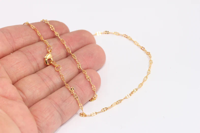 24 carat gold plated shiny, 40cm, oval crushed ready chain. Dimensions: 2x4.3mm Price is per piece. 24 carat gold plated on brass. A quality product, resistant to rust and tarnishing. Do not contact with chemicals and perfumes for long-term use. Passed all tests, does not contain harmful materials. Colors may vary depending on screen settings and ambient light.