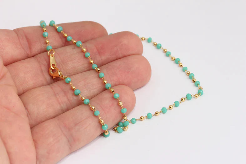 24K Gold Plated Shiny, 40cm, Turquoise Stone Ball Link Ready Chain. Dimensions: 3mm Price per piece. 24K gold plated on brass. A Quality product, resistant to rust and tarnishing. For long-term use, do not contact with chemicals and perfumes. Passed all tests, does not contain harmful materials. Colors may vary depending on screen settings and ambient light.