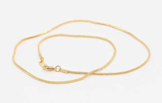 24K Gold Plated Shiny, 45cm, Thin Snake Ready Chain. Dimensions: 1.2mm - Price per piece. 24K gold plated on brass. A Quality product, resistant to rust and tarnishing. Do not contact with chemicals and perfumes for long-term use. Passed all tests, does not contain harmful materials. Colors may vary depending on screen settings and ambient light.