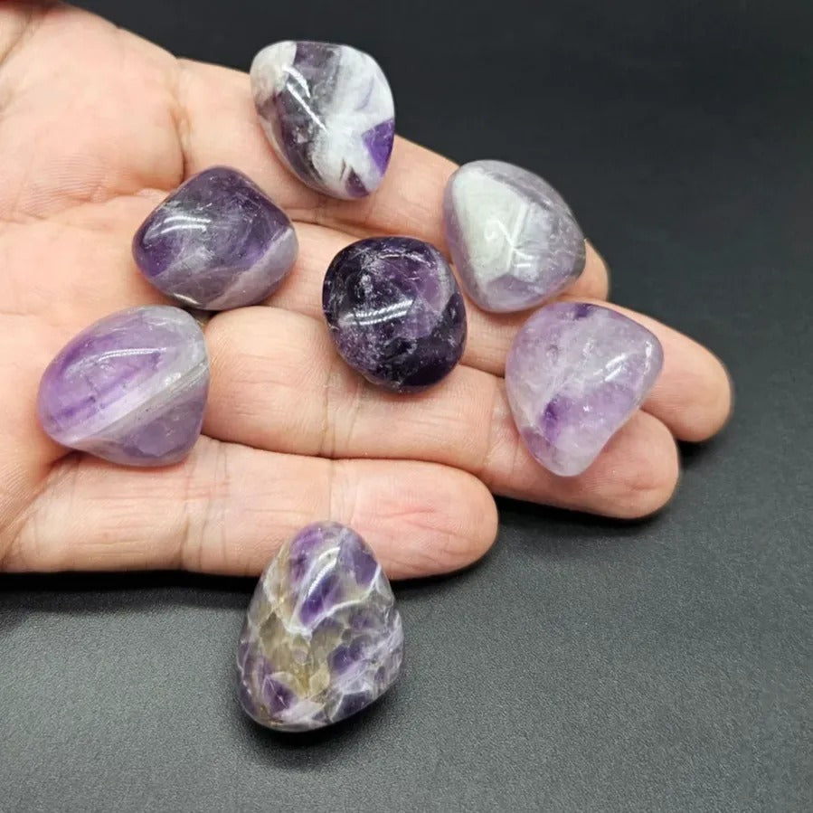 Purple Amethyst Stone Tumbled Natural Stone Energy Stones. Price per piece. Measurements: Varies between 1.5cm and 2cm. Amethyst is believed to help reduce stress enhance focus and concentration and maintain emotional balance. It can repel negative energies and support spiritual growth. Compatible Zodiac Signs: Aquarius Aries Pisces Sagittarius Cancer. Chakra: Associated with the Third Eye Chakra and Crown Chakra. Natural stones may contain different patterns veins and colors depending on their source. There may be slight color differences due to lighting and camera settings.