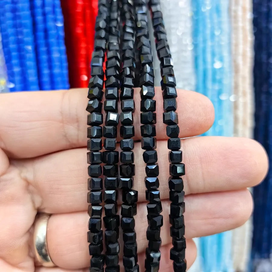 Cube Cut Crystal Beads. Dimensions: 4mm. Sold in a single strand. Each strand contains approximately 92 beads. Crystal beads can be used in necklace bracelet and anklet designs. Crystal beads are made from glass. Their faceted cuts reflect light giving them a shiny appearance. Avoid contact with chemicals and perfume for long-term use. Contains no harmful materials. Colors may vary depending on screen settings and ambient light.