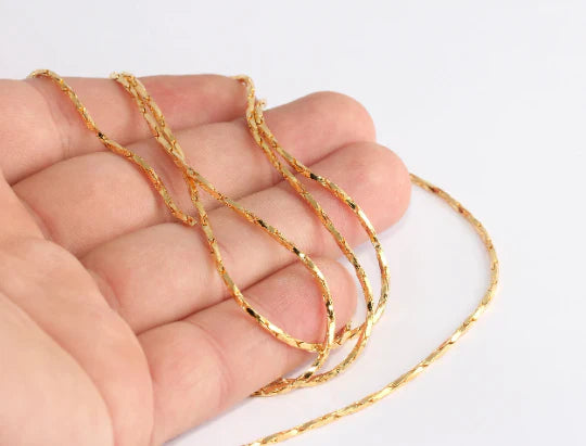 24 Carat Gold Plated Knitted Snake Chain. Dimensions: 1.8 mm PRICE FOR 1 METER. 24 carat gold plated on brass. A Quality product resistant to rust and tarnishing. Do not contact with chemicals and perfumes for long-term use. Passed all tests does not contain harmful materials. Colors may vary depending on screen settings and ambient light.