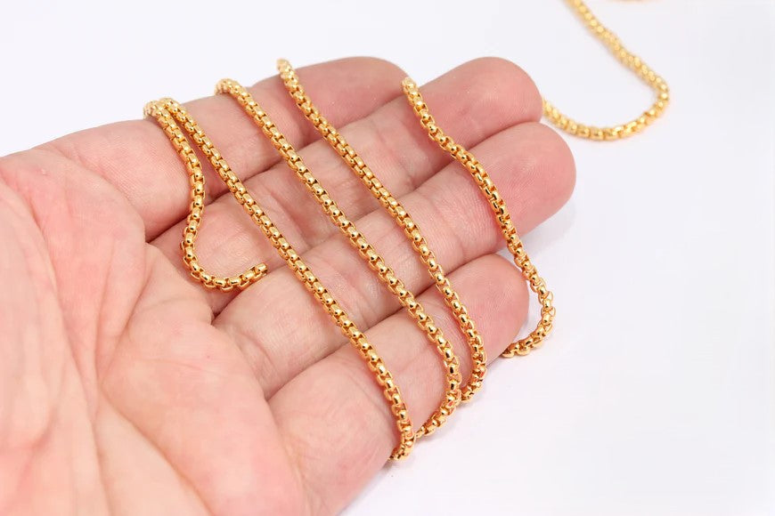 24 Carat Gold Plated Soldered Box Chain. Dimensions: 2.4 mm PRICE FOR 1 METER. 24 carat gold plated on brass. A Quality product resistant to rust and tarnishing. Do not contact with chemicals and perfumes for long-term use. Passed all tests does not contain harmful materials. Colors may vary depending on screen settings and ambient light.