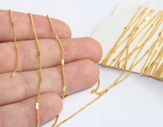 24 Carat Gold Plated Crushed Spacer Thin Border Chain. Dimensions: 1.2x2mm PRICE FOR 1 METER. 24 carat gold plated on brass. A Quality product resistant to rust and tarnishing. Do not contact with chemicals and perfumes for long-term use. Passed all tests does not contain harmful materials. Colors may vary depending on screen settings and ambient light.