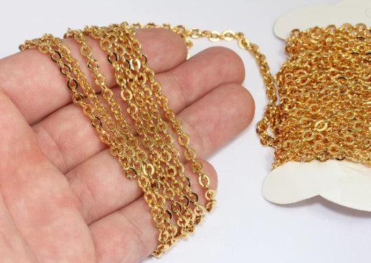 24 Carat Gold Plated Crush Ring Roll Chain. Dimensions: 4x4.5 mm PRICE FOR 1 METER. 24 carat gold plated on brass. A Quality product resistant to rust and tarnishing. Do not contact with chemicals and perfumes for long-term use. Passed all tests does not contain harmful materials. Colors may vary depending on screen settings and ambient light.