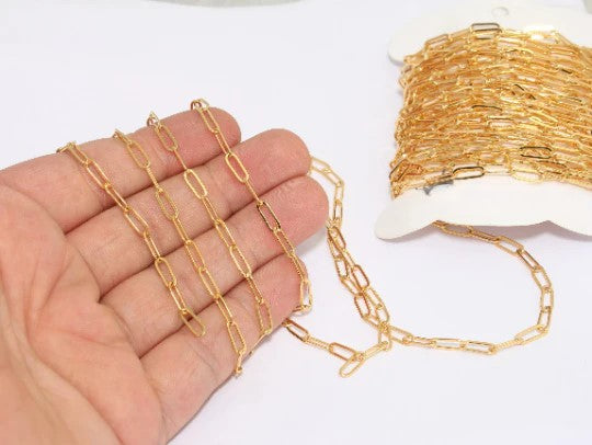 24 Carat Gold Plated Thin Paperclip Chain. Dimensions: 3.6x9.5 mm PRICE FOR 1 METER. 24 carat gold plated on brass. A Quality product resistant to rust and tarnishing. Do not contact with chemicals and perfumes for long-term use. Passed all tests does not contain harmful materials. Colors may vary depending on screen settings and ambient light.