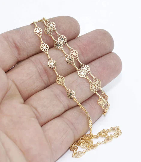 24 Carat Gold Plated Soldered Filigree Chain. Dimensions: 5x7mm PRICE FOR 1 METER. 24 Carat gold plated on brass. A Quality product resistant to rust and tarnishing. Do not contact with chemicals and perfumes for long-term use. Passed all tests does not contain harmful materials. Colors may vary depending on screen settings and ambient light.
