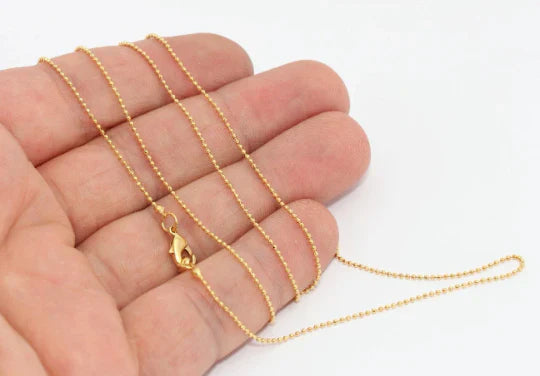 24K Gold Plated Shiny, 1mm/77cm, Thin Ball Ready Chain. Dimensions: 77cm - Price per piece. 24K gold plated on brass. A Quality product, resistant to rust and tarnishing. Do not contact with chemicals and perfumes for long-term use. Passed all tests, does not contain harmful materials. Colors may vary depending on screen settings and ambient light.