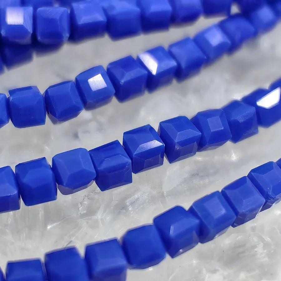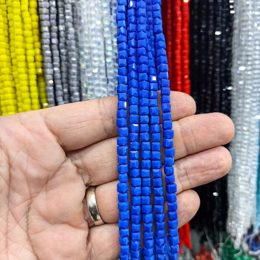 Cube Cut Crystal Beads. Dimensions: 4mm. Sold in a single strand. Each strand contains approximately 92 beads. Crystal beads can be used in necklace bracelet and anklet designs. Crystal beads are made from glass. Their faceted cuts reflect light giving them a shiny appearance. Avoid contact with chemicals and perfume for long-term use. Contains no harmful materials. Colors may vary depending on screen settings and ambient light.