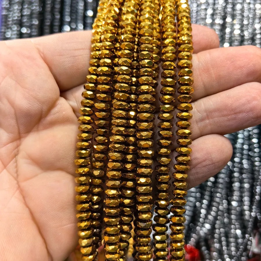 8 mm Gold Faceted Rondelle Hematite Natural Stone. Dimensions: 8 mm. Sold as a single strand. Each strand contains approximately 135 stones. It is a natural Hematite stone. Hematite is a shiny natural stone with a metallic appearance, believed to influence the root chakra. It is thought to provide energy, courage, and joy to the wearer while alleviating stress. Hematite stones can be used in the designs of bracelets, necklaces, earrings, and other jewelry.