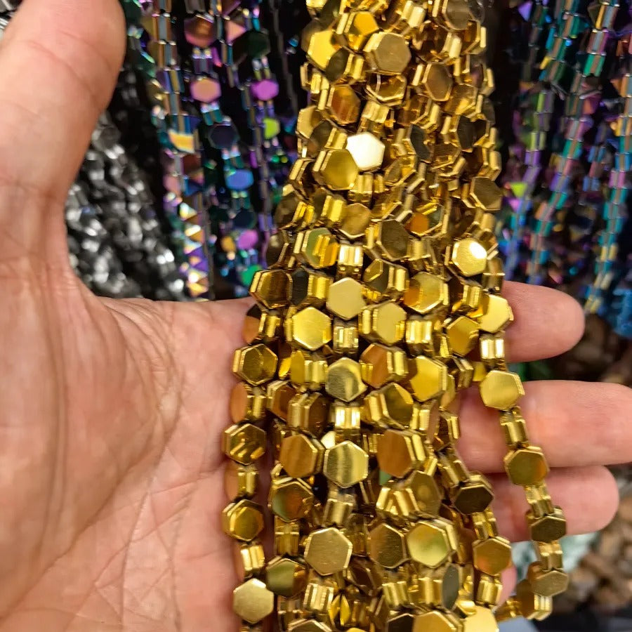 8 mm Gold Honeycomb Cut Hematite Natural Stone. Dimensions: 8 mm. Sold as a single strand. Each strand contains approximately 42 stones. It is a natural Hematite stone. Hematite is a shiny natural stone with a metallic appearance, believed to influence the root chakra. It is thought to provide energy, courage, and joy to the wearer while alleviating stress. Hematite stones can be used in the designs of bracelets, necklaces, earrings, and other jewelry.