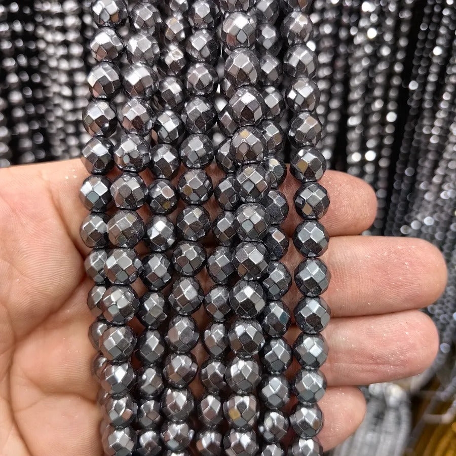 8 mm Smoke Faceted Sphere Polished Hematite Natural Stone. Dimensions: 8 mm. Sold as a single strand. Each strand contains approximately 48 stones. It is a natural Hematite stone. Hematite is a shiny natural stone with a metallic appearance, believed to influence the root chakra. It is thought to provide energy, courage, and joy to the wearer while alleviating stress. Hematite stones can be used in the designs of bracelets, necklaces, earrings, and other jewelry.