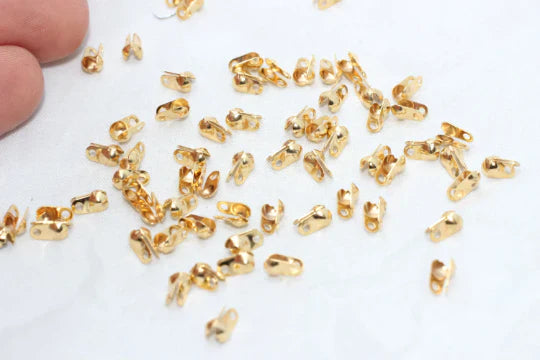 24 Carat Gold Plated Necklace, Bracelet, Anklet, Prayer Beads End Hole Ball Clam Closure. Sold in 50-packs. Dimensions: 2mm. 24 carat gold plated on brass. A Quality product, resistant to rust and tarnishing. Do not contact with chemicals and perfumes for long-term use. Passed all tests, does not contain harmful materials. Colors may vary depending on screen settings and ambient light.