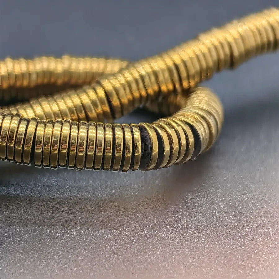 6 mm Gold Yellow Disc Cut Rondelle Hematite Natural Stone.Dimensions: 1 mm x 6 mm.Sold in strands.Each strand contains approximately 365 hematite stones.It is a natural hematite stone.Hematite is a shiny natural stone with a metallic appearance, believed to affect the root chakra.It is thought to provide energy, courage, and joy to the user while relieving stress.Hematite stones can be used in the design of bracelets, necklaces, and earrings.
