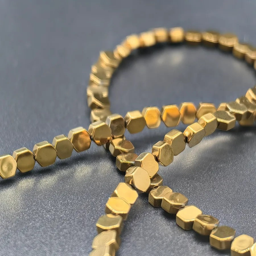 4 mm Gold Yellow Pentagonal Cut Hematite Natural Stone.Dimensions: 2 mm x 4 mm.Sold in strands.Each strand contains approximately 110 hematite stones.It is a natural hematite stone.Hematite is a shiny natural stone with a metallic appearance, believed to affect the root chakra.It is thought to provide energy, courage, and joy to the user while relieving stress.Hematite stones can be used in the design of bracelets, necklaces, and earrings.