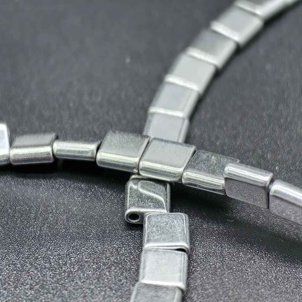 6 mm Silver Color Double-Holed Square Hematite Natural Stone.Dimensions: 2 mm x 6 mm.Sold in strands.Each strand contains approximately 65 stones.It is a natural hematite stone.Hematite is a shiny natural stone with a metallic appearance, believed to affect the root chakra.It is thought to provide energy, courage, and joy to the user while relieving stress.Hematite stones can be used in the design of bracelets, necklaces, and earrings.