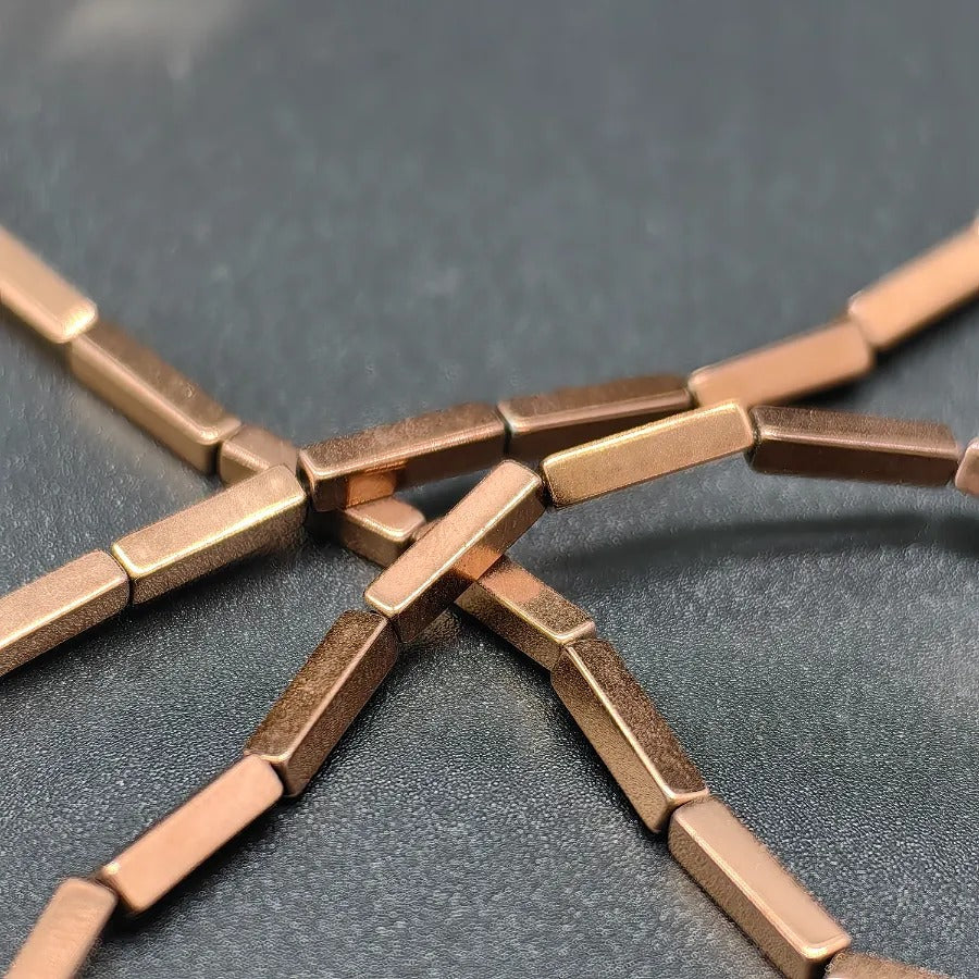 8 mm Copper Thin Rectangle Cut Hematite Natural Stone.Dimensions: 2 mm x 8 mm.Sold in strands.Each strand contains approximately 50 stones.It is a natural hematite stone.Hematite is a shiny natural stone with a metallic appearance, believed to affect the root chakra.It is thought to provide energy, courage, and joy to the user while relieving stress.Hematite stones can be used in the design of bracelets, necklaces, and earrings.
