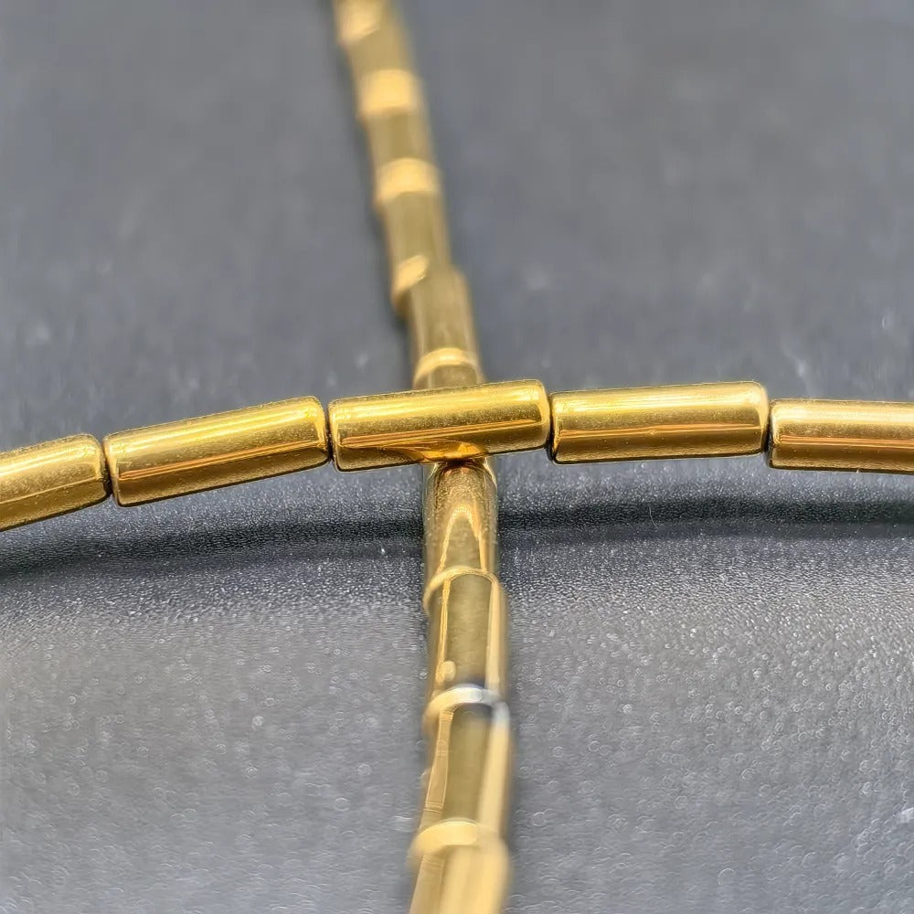 8 mm Gold Cylinder Cut Hematite Natural Stone.Dimensions: 3 mm x 8 mm.Sold in strands.Each strand contains approximately 44 hematite stones.It is a natural hematite stone.Hematite is a shiny natural stone with a metallic appearance, believed to affect the root chakra.It is thought to provide energy, courage, and joy to the user while relieving stress.Hematite stones can be used in the design of bracelets, necklaces, and earrings.