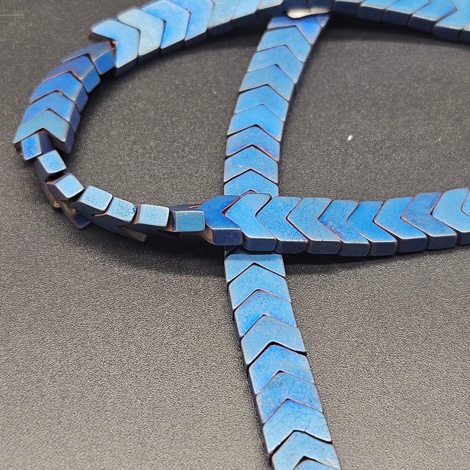 8 mm Matte Blue Chevron Cut Hematite Natural Stone.Dimensions: 8 mm x 3 mm.Sold in strands.Each strand contains approximately 95 hematite stones.It is a natural hematite stone.Hematite is a shiny natural stone with a metallic appearance, believed to affect the root chakra.It is thought to provide energy, courage, and joy to the user while relieving stress.Hematite stones can be used in the design of bracelets, necklaces, and earrings.