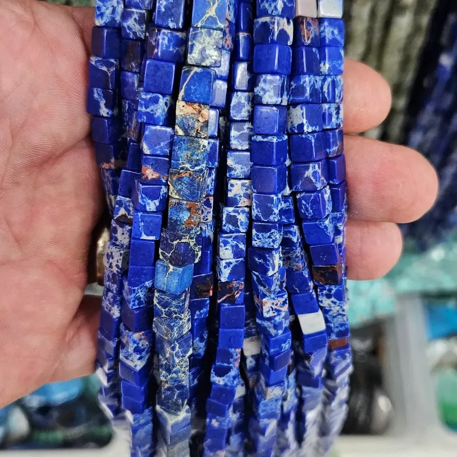 4 MM Cube Cut Blue Variscite Natural Stone Strand. Price per strand. Approximately 85 stones per strand. Natural stones may contain different patterns veins and colors depending on their source. Small color differences may occur due to light and camera settings.