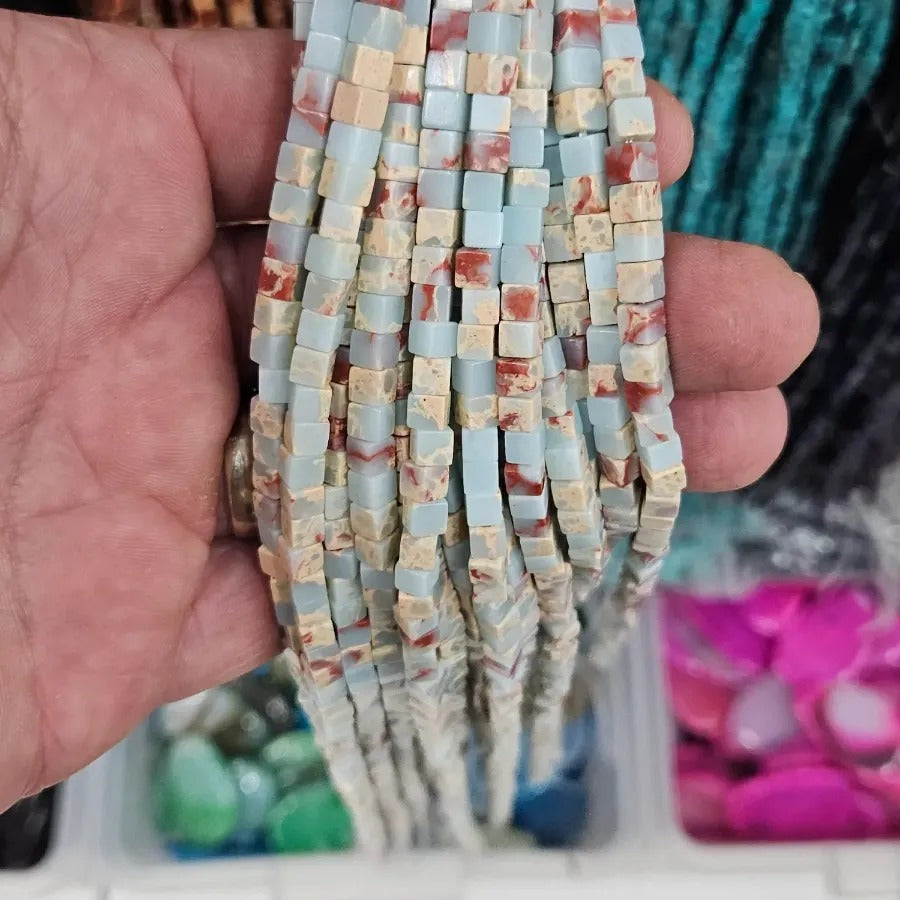 4 MM Cube Cut Light Blue Variscite Natural Stone Strand. Price per strand. Approximately 85 stones per strand. Natural stones may contain different patterns veins and colors depending on their source. Small color differences may occur due to light and camera settings.