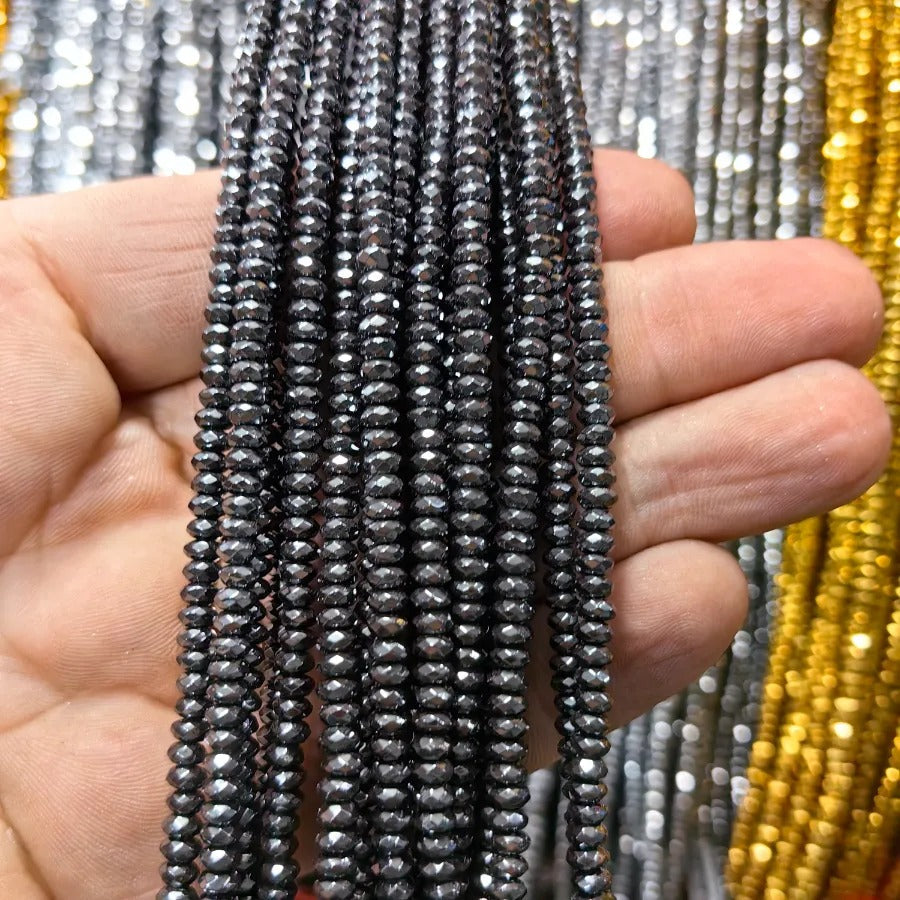 4 mm Gunmetal Faceted Rondelle Hematite Natural Stone.Dimensions: 4 mm x 1 mm.Sold in strands.Each strand contains approximately 175 hematite stones.It is a natural hematite stone.Hematite is a shiny natural stone with a metallic appearance, believed to affect the root chakra.It is thought to provide energy, courage, and joy to the user while relieving stress.Hematite stones can be used in the design of bracelets, necklaces, and earrings.