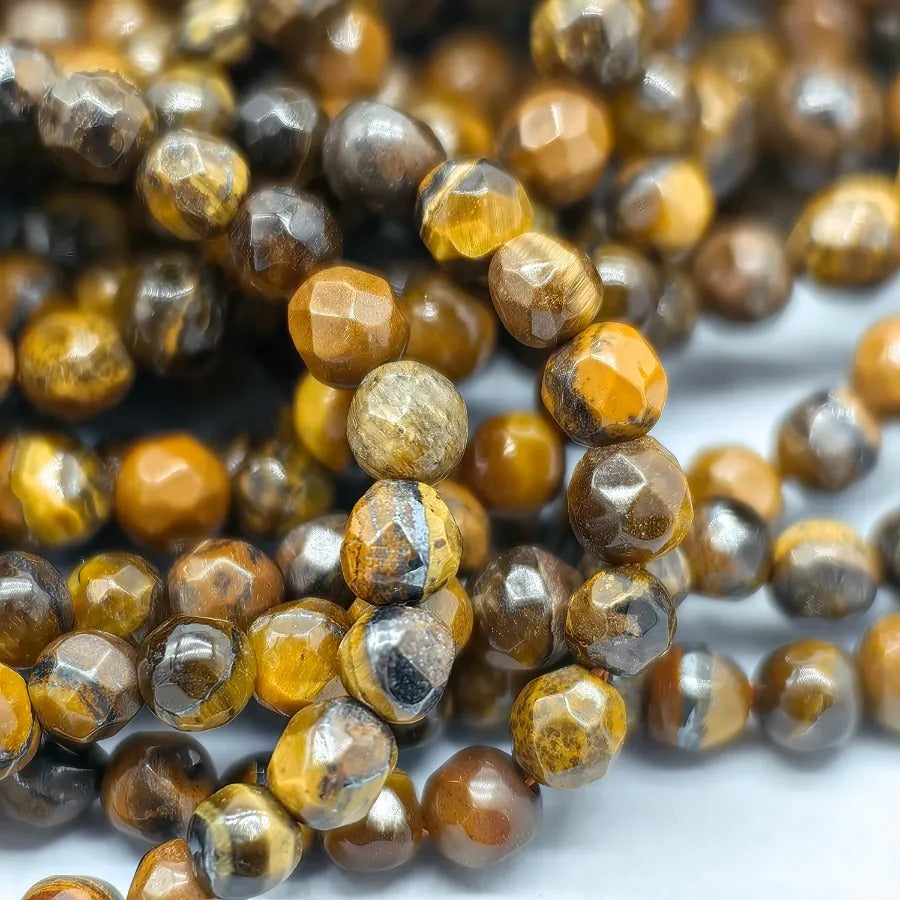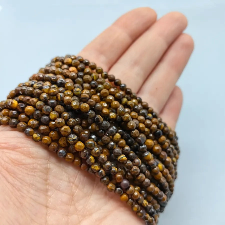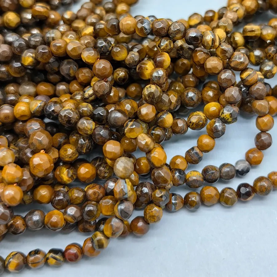 4 mm Tiger Eye Faceted Sphere Cut Natural Stone Strand. Price per strand. Approximately 92 stones per strand. Natural stones may contain different patterns veins and colors depending on their source. Small color differences may occur due to light and camera settings.
