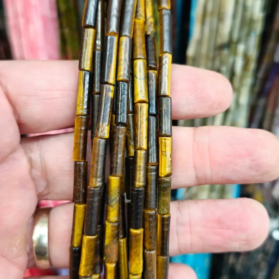 4x14 mm Cylinder Cut Tiger Eye Natural Stone Strand. Price per strand. Approximately 28 stones per strand. Natural stones may contain different patterns veins and colors depending on their source. Small color differences may occur due to light and camera settings.