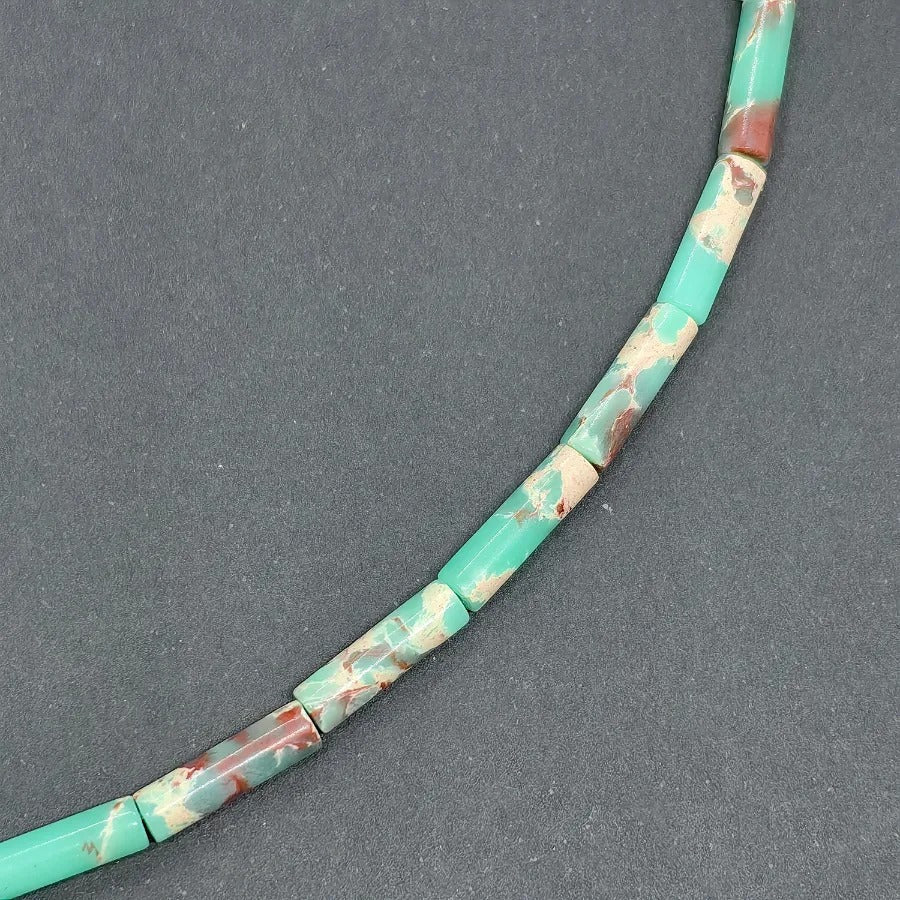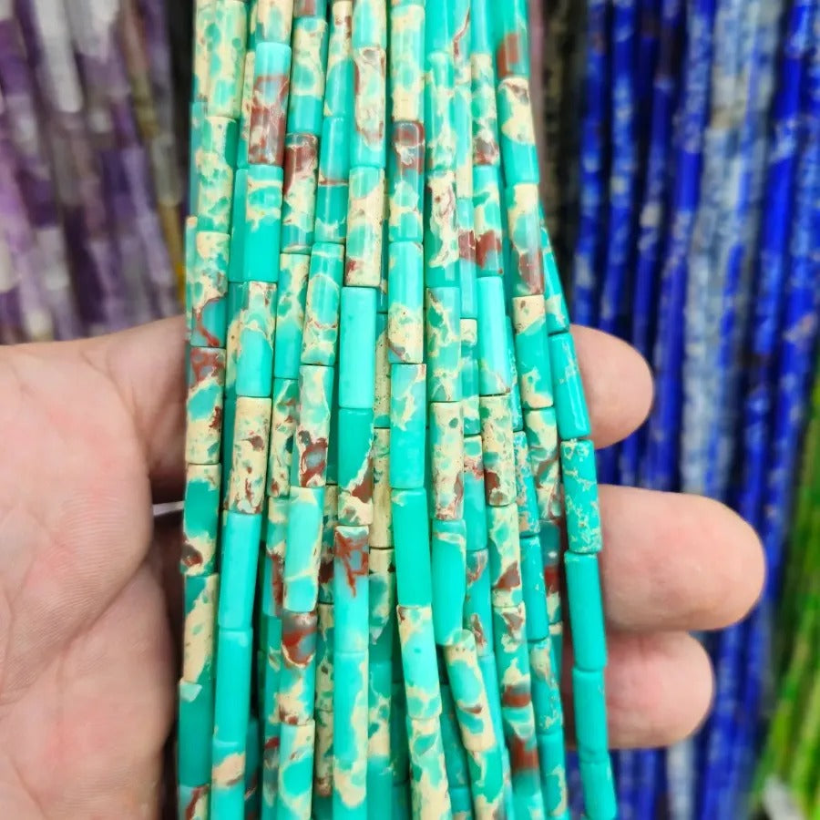 4x14 mm Cylinder Cut Variscite Natural Stone Strand. Price per strand. Approximately 28 stones per strand. Natural stones may contain different patterns veins and colors depending on their source. Small color differences may occur due to light and camera settings.