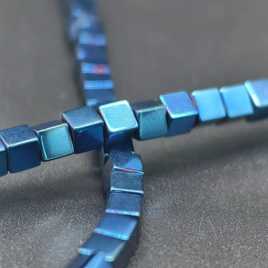 4 mm Blue Square Cube Cut Hematite Natural Stone.Dimensions: 4 mm x 4 mm.Sold in strands.Each strand contains approximately 100 hematite stones.It is a natural hematite stone.Hematite is a shiny natural stone with a metallic appearance, believed to affect the root chakra.It is thought to provide energy, courage, and joy to the user while relieving stress.Hematite stones can be used in the design of bracelets, necklaces, and earrings.