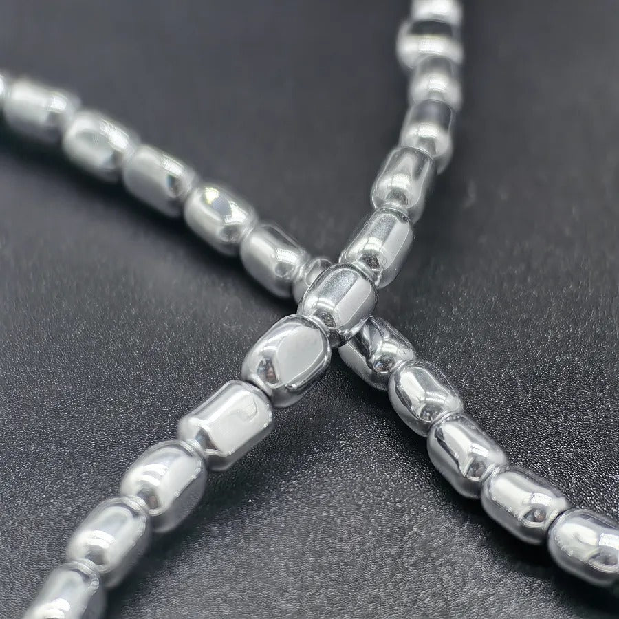 6 mm Silver Flat Barrel Cut Hematite Natural Stone.Dimensions: 4 mm x 6 mm.Sold in strands.Each strand contains approximately 60 hematite stones.It is a natural hematite stone.Hematite is a shiny natural stone with a metallic appearance, believed to affect the root chakra.It is thought to provide energy, courage, and joy to the user while relieving stress.Hematite stones can be used in the design of bracelets, necklaces, and earrings.