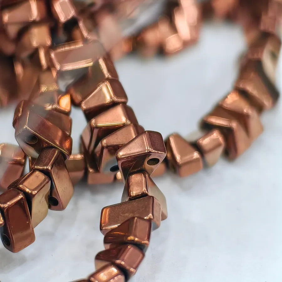 6 mm Copper Double-Hole Tila Pyramid Cut Hematite Natural Stone.Double-Holed.Dimensions: 3 mm x 6 mm.Sold in strands.Each strand contains approximately 135 hematite stones.It is a natural hematite stone.Hematite is a shiny natural stone with a metallic appearance, believed to affect the root chakra.It is thought to provide energy, courage, and joy to the user while relieving stress.Hematite stones can be used in the design of bracelets, necklaces, and earrings.