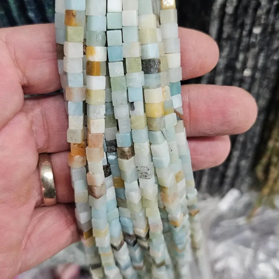 6 mm Cube Cut Blue Agate Natural Stone Strand. Strand price. Approximately 60 stones per strand. Natural stones may contain different patterns veins and colors depending on the source. Colors may vary slightly due to light and camera settings.