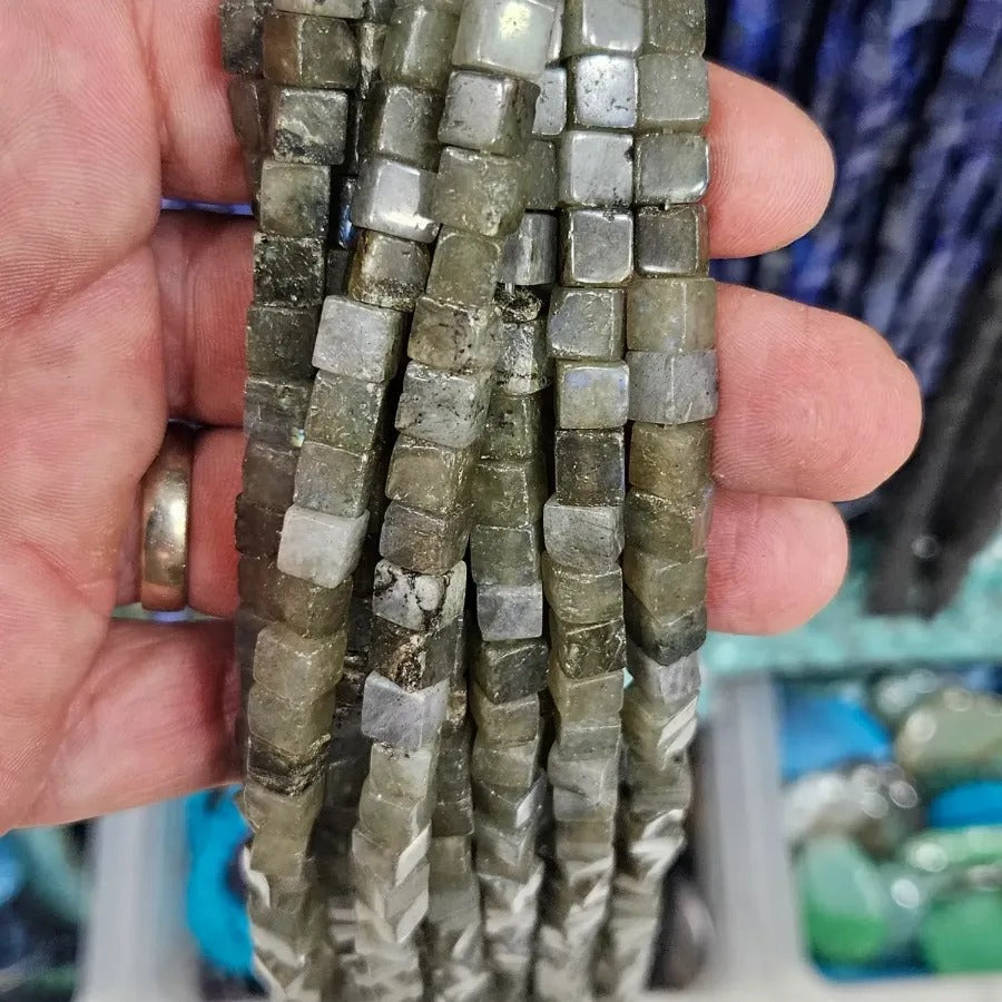 6 mm Cube Cut Labradorite Natural Stone Strand. Strand price. Approximately 60 stones per strand. Natural stones may contain different patterns veins and colors depending on the source. Colors may vary slightly due to light and camera settings.