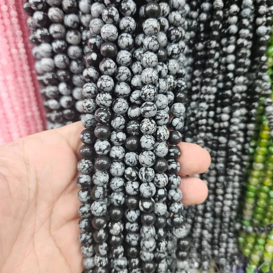6 mm Snow Obsidian Natural Stone Strand. Strand price. Approximately 64 stones per strand. Natural stones may contain different patterns veins and colors depending on the source. Colors may vary slightly due to light and camera settings.
