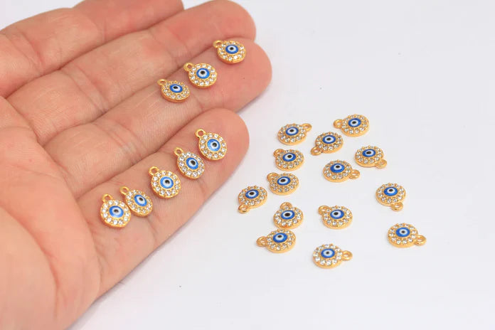 24K Gold Plated White Zircon Stone Round Evil Eye Charms Round Evil Eye Pendant. Dimensions: 7x9mm Price is per piece. 24K gold plated on brass. A Quality product does not rust or tarnish. Do not contact with chemicals and perfumes for long-term use. Passed all tests does not contain harmful materials. Colors may vary depending on screen settings and ambient light.