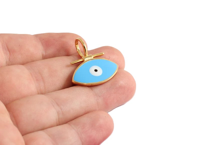 24 Carat Shiny Gold Plated Blue Enameled Eye Medallion Evil Eye Charm. Dimensions: 27x28mm Price is per piece. 24 carat gold plated on brass. A Quality product resistant to rust and tarnishing. Do not contact with chemicals and perfumes for long-term use. Passed all tests does not contain harmful materials. Colors may vary depending on screen settings and ambient light.