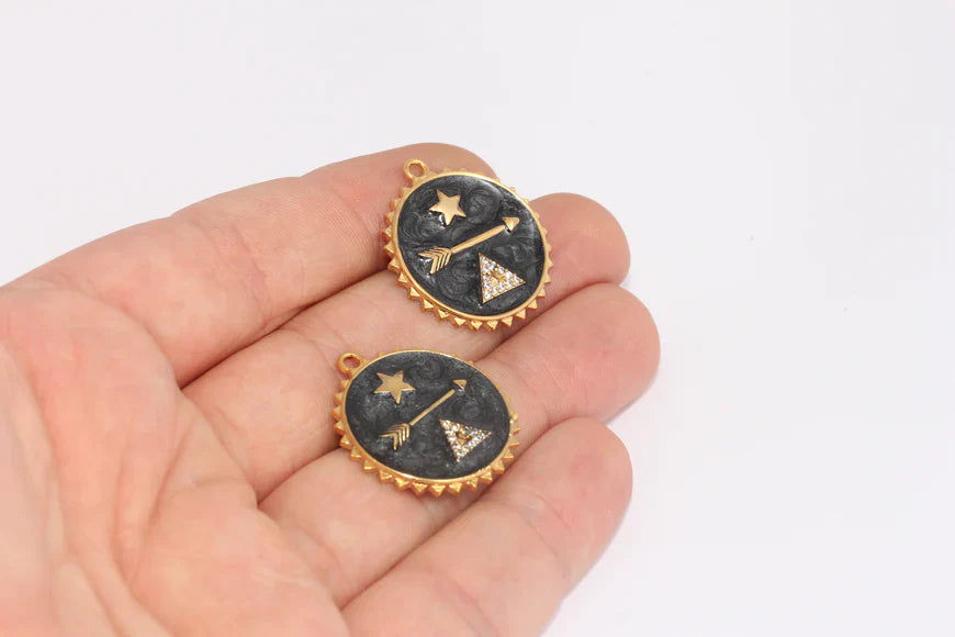 24 carat bright gold plated star arrow zircon stone triangle figure black color enameled medallion pendant. Dimensions: 24x26mm Price is per piece. 24 carat gold plated on brass. A quality product resistant to rust and tarnishing. Do not contact with chemicals and perfumes for long-term use. Passed all tests does not contain harmful materials. Colors may vary depending on screen settings and ambient light.