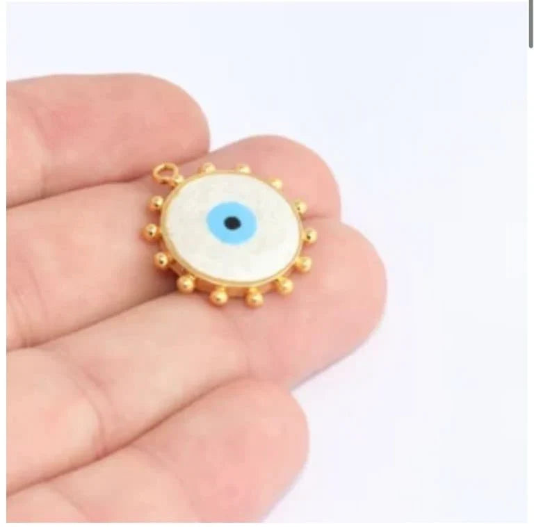 24K Shiny Gold Plated Sun Figured Evil Eye Necklace Pendant. Dimensions: 22mm Price is per piece. 24K gold plated on brass. A Quality product resistant to rust and tarnishing. Do not contact with chemicals and perfumes for long-term use. Passed all tests does not contain harmful materials. Colors may vary depending on screen settings and ambient light.