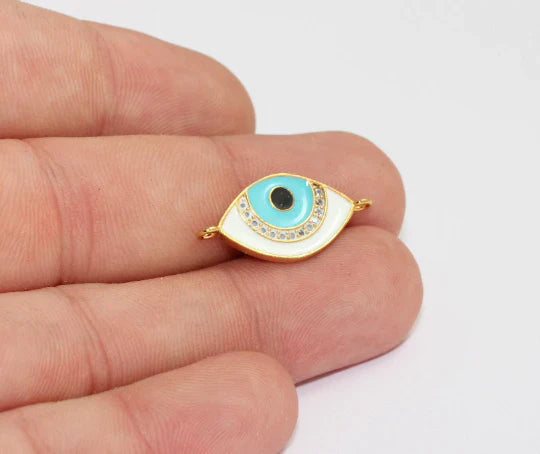 24 Carat Shiny Gold Plated Zircon Stone White Turquoise Double Handle Eye Evil Eye Necklace Pendant Bracelet Spacer Dimensions: 12x26 mm. Price is per piece. 24 carat gold plated on brass. A Quality product resistant to rust and tarnishing. Do not contact with chemicals and perfumes for long-term use. Passed all tests does not contain harmful materials. Colors may vary depending on screen settings and ambient light.