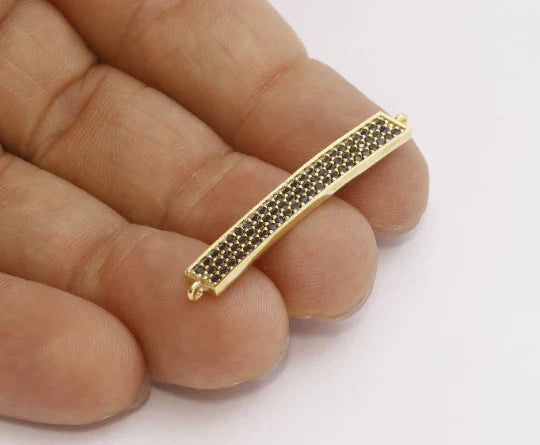 24 Gold Gold Plated Black Zircon Stone Shiny Rectangular Double Handle Jewelry Piece. Dimensions: 5x40mm Price is per piece. 24 carat gold plated on brass. A Quality product resistant to rust and tarnishing. Do not contact with chemicals and perfumes for long-term use. Passed all tests does not contain harmful materials. Colors may vary depending on screen settings and ambient light.