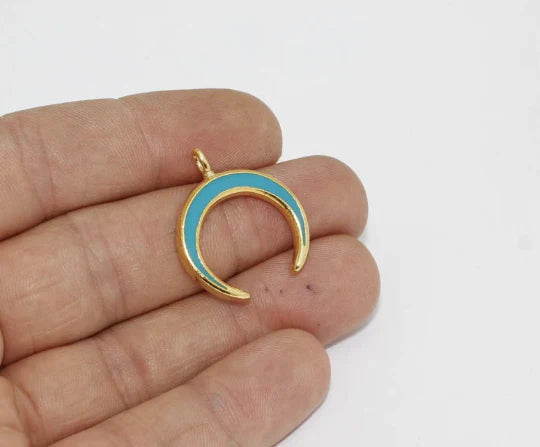24 Carat Gold Plated Blue Enameled Crescent Pendant. Dimensions: 23x27mm Price is per piece. 24 carat gold plated on brass. A Quality product resistant to rust and tarnishing. Do not contact with chemicals and perfumes for long-term use. Passed all tests does not contain harmful materials. Colors may vary depending on screen settings and ambient light.