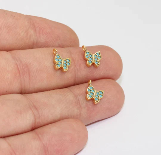 24 Carat Gold Plated Blue Zircon Stone Butterfly Charms Butterfly Pendant. Dimensions: 8x9mm Price is per piece. 24 carat gold plated on brass. A Quality product does not rust or tarnish. For long-term use do not contact with chemicals and perfumes. Passed all tests does not contain harmful materials. Colors may vary depending on screen settings and ambient light.
