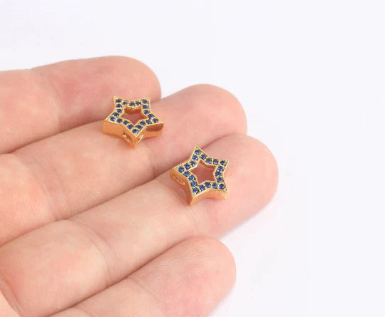 24 Carat Gold Plated Blue Zircon Stone Star Charms Star Pendant. Dimensions: 13mm Price is per piece. 24 carat gold plated on brass. A Quality product does not rust or tarnish. Do not contact with chemicals and perfumes for long-term use. Passed all tests does not contain harmful materials. Colors may vary depending on screen settings and ambient light.