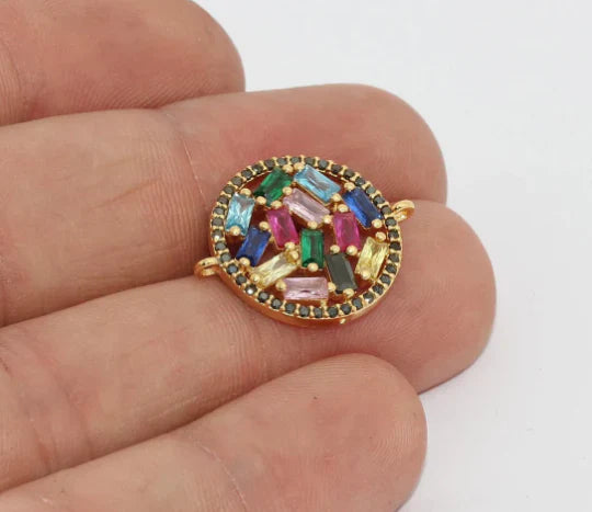 24K Gold Plated Colorful Zircon Stone Shiny Round Charms Round Pendant. Dimensions: 18x21mm Price is per piece. 24K gold plated on brass. A Quality product resistant to rust and tarnishing. Do not contact with chemicals and perfumes for long-term use. Passed all tests does not contain harmful materials. Colors may vary depending on screen settings and ambient light.