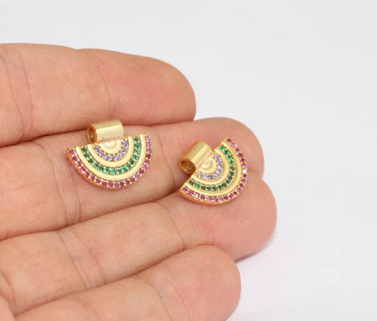 24K Gold Plated Colorful Zircon Stone Shiny Semicircle Charms Semicircle Pendant. Dimensions: 13x18mm Price is per piece. 24K gold plated on brass. A Quality product resistant to rust and tarnishing. Do not contact with chemicals and perfumes for long-term use. Passed all tests does not contain harmful materials. Colors may vary depending on screen settings and ambient light.
