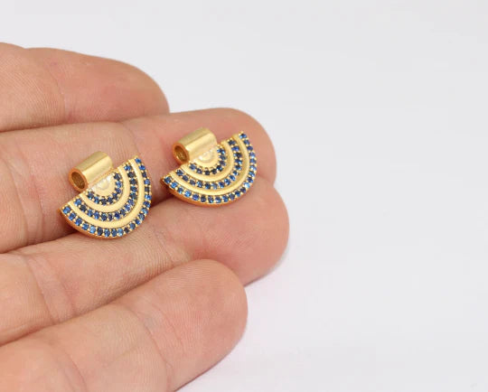 24 Carat Gold Plated Dark Blue Zircon Stone Shiny Semicircle Charms Semicircle Pendant. Dimensions: 13x18mm Price is per piece. 24 carat gold plated on brass. A Quality product resistant to rust and tarnishing. Do not contact with chemicals and perfumes for long-term use. Passed all tests does not contain harmful materials. Colors may vary depending on screen settings and ambient light.