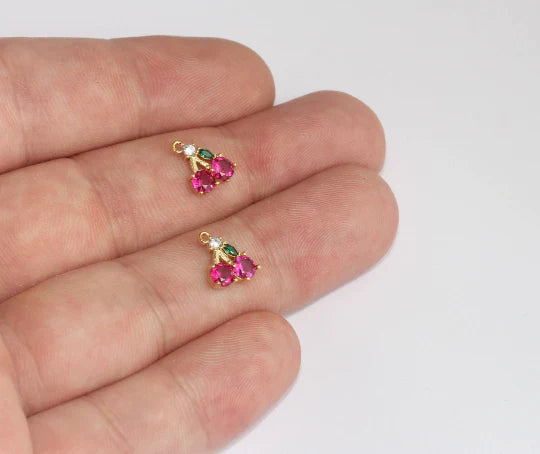 24K Gold Plated Pink Green White Zircon Stone Shiny Cherry Charms Cherry Pendant. Dimensions: 8.5x10mm Price is per piece. 24K gold plated on brass. A Quality product does not rust or tarnish. Do not contact with chemicals and perfumes for long-term use. Passed all tests does not contain harmful materials. Colors may vary depending on screen settings and ambient light.