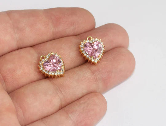 24K Gold Plated Pink White Zircon Stone Shiny Heart Charms Heart Pendant. Dimensions: 13x15mm Price is per piece. 24K gold plated on brass. A Quality product resistant to rust and tarnishing. Do not contact with chemicals and perfumes for long-term use. Passed all tests does not contain harmful materials. Colors may vary depending on screen settings and ambient light.