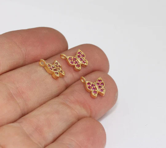 24 Carat Gold Plated Purple Zircon Stone Shiny Butterfly Charms Butterfly Pendant. Dimensions: 8x9mm Price is per piece. 24 carat gold plated on brass. A Quality product does not rust or tarnish. Do not contact with chemicals and perfumes for long-term use. Passed all tests does not contain harmful materials. Colors may vary depending on screen settings and ambient light.
